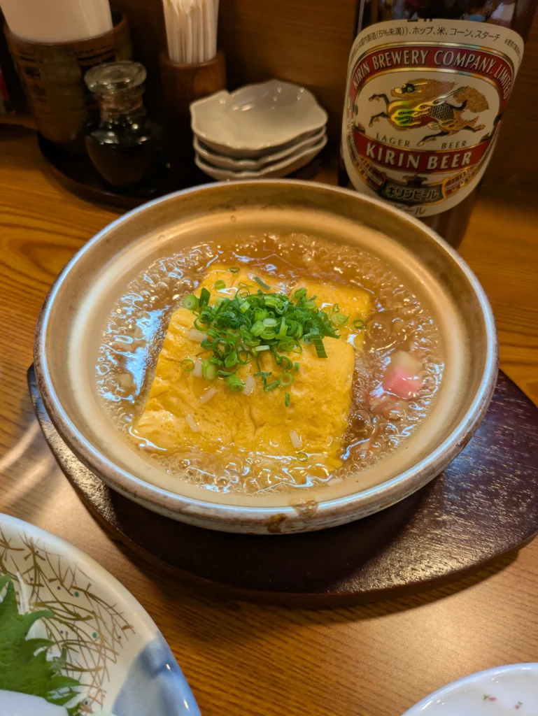 ふんわりと焼かれた出汁巻きに、とろみのある餡がたっぷりとかかって登場。