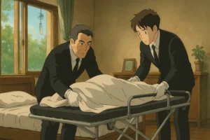 旅人は明治葬儀社の引き戸を開けた瞬間、冷房の冷気と白檀の香りに包まれ、ほっとした自分を感じた。